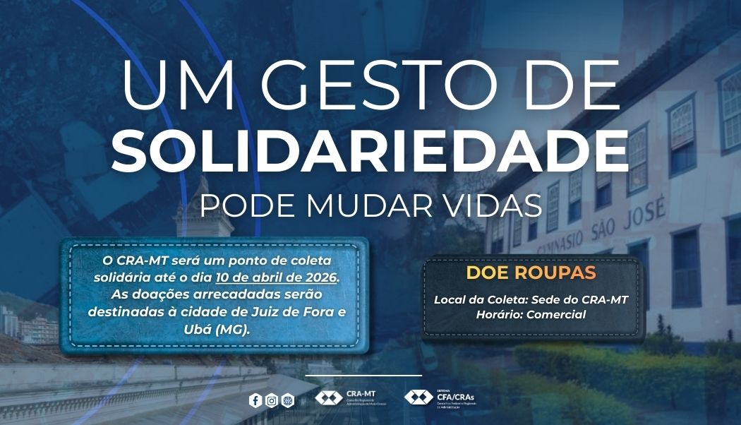Últimas Notícias Mulher ADM Segura: pesquisa mapeia assédio e violência contra trabalhadoras Ser tocada de forma inapropriada, receber comentários ou elogios de cunho sexual, ser chantageada por resistir a investidas. Estas são ...Leia Mais Saiba tudo sobre as anuidades 2026, já disponíveis para pagamento Garanta já os benefícios de pagar dentro do prazo e usufrua dos benefícios A anuidade 2026 do Sistema CFA/CRAs já ...Leia Mais CRA-MT Lança Plataforma de Business Intelligence e Avança na Modernização da Gestão Pública e da Fiscalização Profissional O Conselho Regional de Administração de Mato Grosso (CRA-MT) deu um passo significativo rumo à modernização institucional com o lançamento ...Leia Mais Conheça as vencedoras do Prêmio Ailema Pucú de Administração e Empreendedorismo Feminino As premiações e condecorações das vencedoras acontecerão durante o Fórum Internacional de Administração, em novembro As vencedoras da primeira edição ...Leia Mais Admª. Norma Sueli Costa de Andrade recebe título de Administradora Emérita 2024 do CRA-MT Na noite da última quarta-feira, 8 de outubro, o Conselho Regional de Administração de Mato Grosso (CRA-MT) realizou, em sua ...Leia Mais Tecnólogos das áreas da Administração celebram sua contribuição para o desenvolvimento do país 6 de outubro, é Dia do Tecnólogo, data criada para valorizar os profissionais formados em cursos superiores de tecnologia. No ...Leia Mais 1 2 3 … 65 › Projetos e Ações Calendário de Eventos Nenhum post encontrado. There are no upcoming events at this time. Últimas Publicações Confira outras publicações
